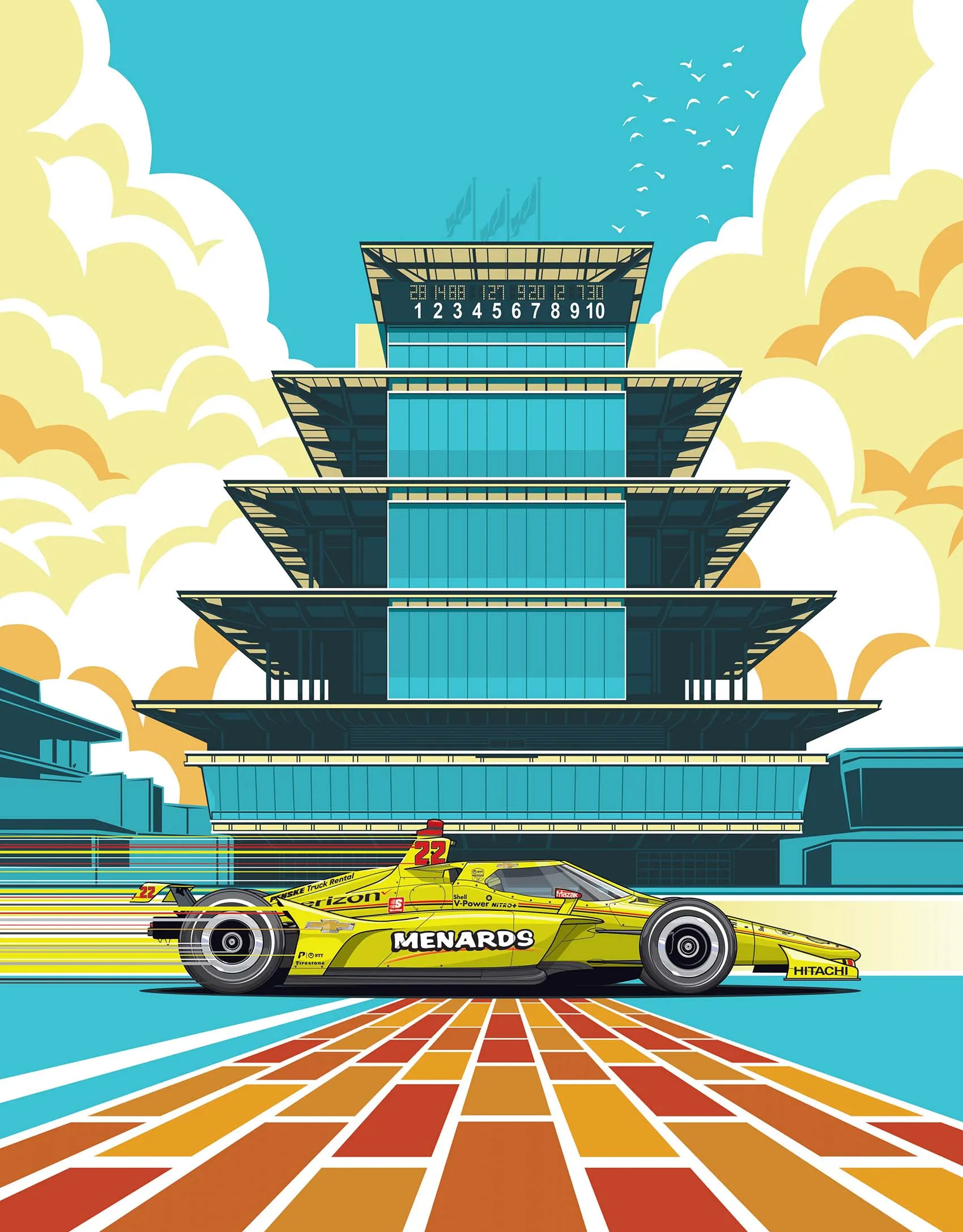 This wonderful Laguette artwork showcases “The Brickyard” that graced Issue No. 305 (July 2020), called “The Legendary Races Issue.” Here, Simon Pagenaud’s car sits on the start/finish line. It’s also the one with a squirrel hiding in the artwork!